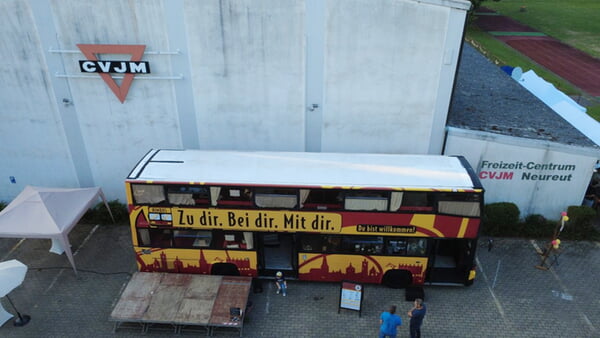 Die Ev. Jugend Karlsruhe-Land kommt mit dem Doppeldecker-Bus zu den Menschen. Ein Doppeldecker umgebaut zur mobilen Kirche, zum Begegnungsort, zum rollenden Cafe, Treffpunkt und Hoffnungsträger – ein Ort, der zukünftig im ganzen Kirchenbezirk wirken soll.