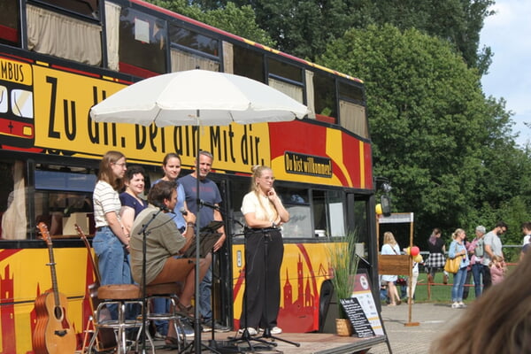Familien, Jugendliche, Gäste aus dem Kirchenbezirk, Vertreterinnen und Vertreter der Landeskirche, Akteure aus Neureut und viele Neugierige kamen zusammen, um mitzufeiern, den Bus zu erkunden und die Vision dahinter kennenzulernen. Auf der bunt gestalteten Essens- und Trinkenmeile gab es für jeden etwas: Kinder schleckten Zuckerwatte und Eis, tranken Limo oder Spezi, während Eltern bei Wurstweck oder Kuchen ins Gespräch kamen.
