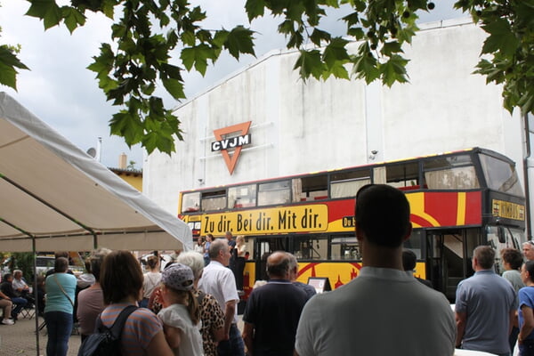 Mit einem kleinen Wunder begann der Tag der NimBus-Einweihung: Noch am Vormittag hingen dunkle Wolken am Himmel und feiner Regen fiel auf das CVJM-Gelände in Neureut. Doch pünktlich zum Start um 15.30 Uhr verzogen sich die Wolken, und strahlender Sonnenschein hieß die Gäste willkommen – ein schönes Bild für den Aufbruch, den der neue mobile Doppelstockbus, liebevoll „NimBus“ (das Göttliche, das Besondere) genannt, nun beginnt.