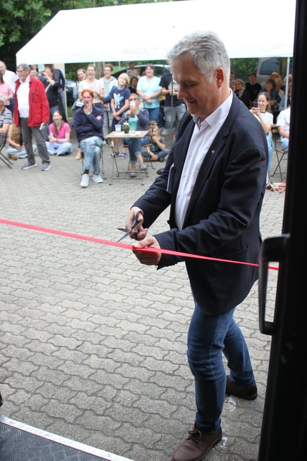 Der feierliche Moment der Einweihung kam, als Dekan Martin Reppenhagen und Ortsvorsteher Thomas Jäger gemeinsam das rote Band durchschnitten und damit den NimBus offiziell eröffneten. In einer Gesprächsrunde teilten Mitglieder des NimBus-Teams, Schulleiterin Frau Biehl, Axel Ebert von der Landeskirche, der Neureuter Jugendliche Tim Uhlmann und CVJM-Vorsitzender Frank Knieriemen ihre Ideen, Hoffnungen und Visionen mit dem Bus. Immer wieder wurde spürbar, dass hier mehr entsteht als nur ein rollender Raum – eine Vision, in der Gottes Führung und Segen mitschwingen. Auf einem großen Visionboard konnten auch die Besucher ihre eigenen Wünsche und Träume für den Bus hinterlassen.