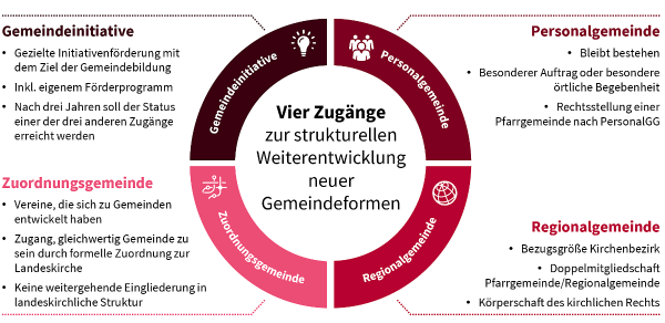 Das Gesetz für neue Gemeindeformen ermöglicht, dass es neben parochialen Gemeinden auch andere Formen geben kann. Dazu zählen die Personalgemeinde, die Regionalgemeinde und die Zuordnungsgemeinde. Hier eine kleine Übersicht, bevor es noch einmal detaillierter erklärt wird: